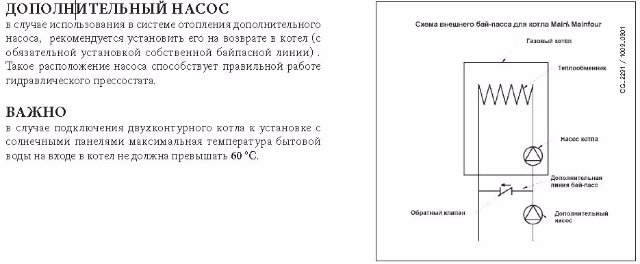 есть в инструкции описание использования дополнительного насоса, вот можно прибегнуть к такому способу постоянной циркуляции с термостатом..mikkhr писал(а): Если бы насос продолжать крутить равномерно распределяя остывающий теплоноситель всё было бы идеально.