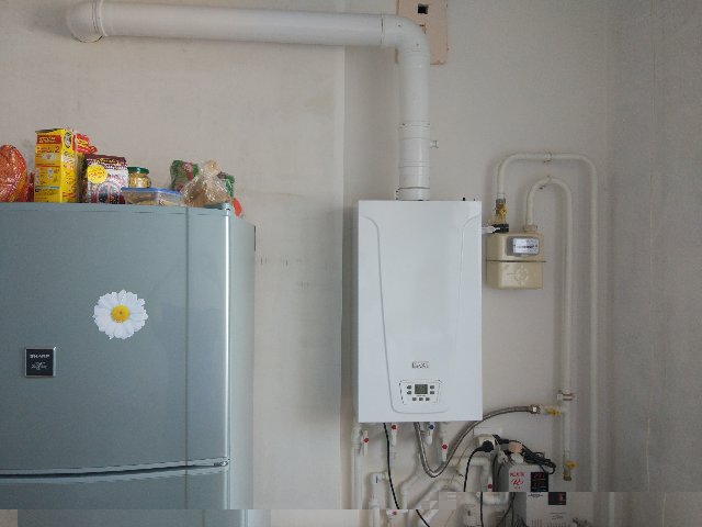 По вентиляции в стене вентиляционный короб устроен как коаксиальный внутри труба из нержавейки меньшего диаметра чем сам короб который вроде из красного кирпича квадратной или прямоугольной формы. Котел берет воздух для сгорания газа с внешнего диаметра а продуты после сгорания отводятся по внутренней трубе.