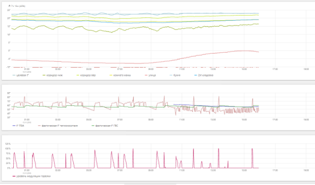 Стало совсем жестко, котел включался и выключался буквально на несколько секунд. К тому же начала падать t воздуха в помещении. Издевательство над ним пришлось прекратить, вернув пока 14-ю кривую.