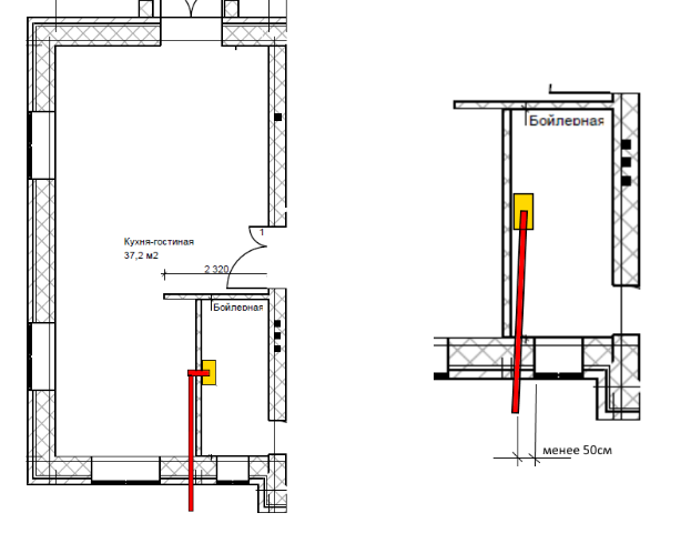 Ввиду того, что не вписываюсь в размер 50см от дымохода до края оконного проема, возможно ли вывести данный коаксиальный дымоход через соседнее помещение (кухня-гостинная), схема прокладки прилагается. Прокладку дымохода предполагается произвести в 30-40см от плиты перекрытия, при отделке помещения предполагается данный дымоход зашить в короб.