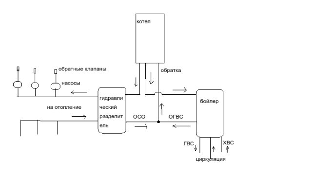 при работе котла на ГВС (бойлер), клапан переключается на подачу на бойлер. соотвественно, греется его подача и обратка (ОГВС) и это правильно, но так же греется и ОСО, что не логично. можно, конечно, предположить, что теплоноситель в ней общий и происходит нагрев, но не в таких объемах же, чтобы прогреть гидравлический разделитель
