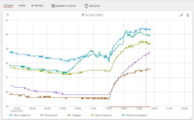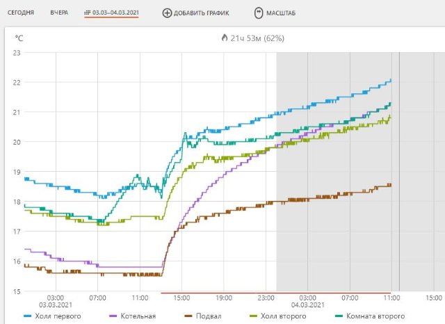 Ограничение теплоносителя 70°C, целевая в помещении 23°C, фактическая теплоносителя 53°C, а дальше гадайте... На графике 5 зон/помещений, какая выбрана для целевой в 23°C? Какой регулятор в зонте рулит процессом?А может котлу этого и не нужно!Naturalist писал(а): 04 мар 2021, 10:57 Почему котёл не хочет разгоняться до 60-65 градусов и ограничивается 53-мя ?