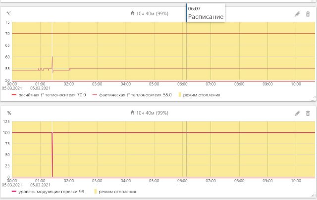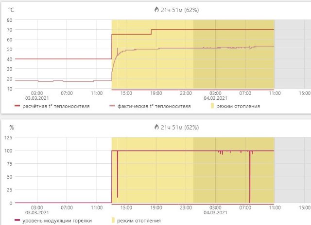 В районе полвторого непонятный скачок температуры теплоносителя (или глюк какой) до 60 градусов, и модуляция в этот момент тоже в ноль - такое впечатление, что не хочет котел такой температуры.
