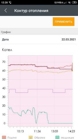 Ну вот, например, позавчера. Несколько часов идеально, несколько часов нулевая модуляция, но греет. Целевая температура понизилась на 1 градус, значит теплопотери менялись за эти часы не очень сильно. А котел ушел из нормального режима в "странный".Starik писал(а): 05 апр 2021, 17:22 Какая потребная (заданная) температура подачи в СО в этот момент? Что от котла требует выполнить тот девайс, который к котлу подключен?