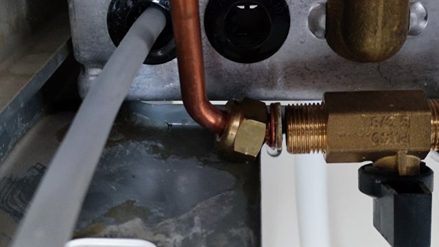 При выключенном котле капает из открученного от крана подпитки системы отопления (30) патрубка со стороны змеевика бойлера, то есть из системы отопления, с которой предварительно слили теплоноситель. (на фото видно каплю).