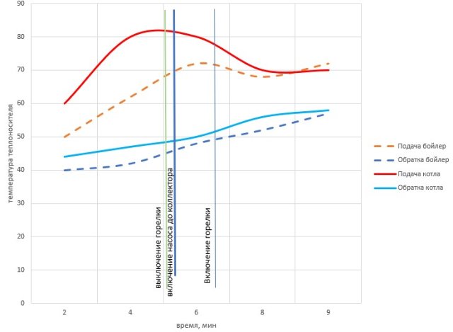 В начале нагрева отключил первый насос( который до коллектора), чтобы понять возникающую разницу в температурах. Потом, когда горелка выключилась из-за достижения котлом 80гр(а насос бойлера продолжал работать, включил первый насос. Наглядно видно, что разница значительно уменьшилась при работе этого насоса.