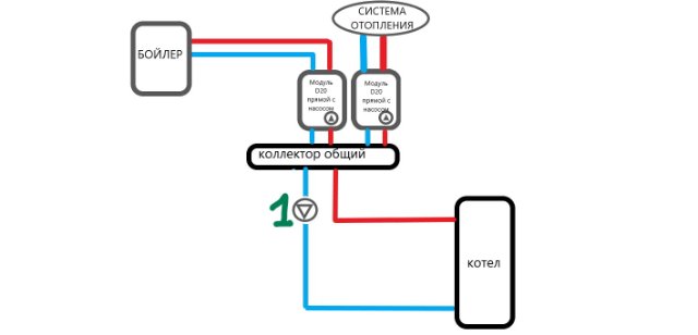 Так же было замечено, что при выключенных насосах отопления и бойлера, если первый насос постоянно включен, то он прокачивает не только отопление, но и бойлер(который стоит в подвале). Надеюсь установка обратных клапанов решит эту проблему. Первый насос планирую, чтобы через автоматику включался только с одним из насосов после коллектора(установленных в модулях).