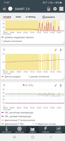 Инерция действительно малая. Дом теплый. Регулирование происходит по воздуху. Датчик подключен к зонту. Но, тут есть еще и отсечка по температуре теплоносителя (36 градусов). Если бы график температуры теплоносителя был гладким, без пилы, то возможно все было бы нормально. Да и почему модуляция тоже подскакивает пиками до 50%?tsv63 писал(а): 19 окт 2021, 10:57 ибо малая инерция чего то. По какой среде происходит регулирование?