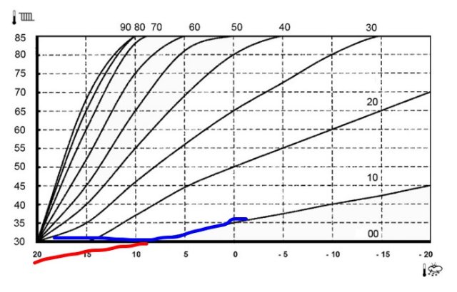 Для меня вопрос очень важен, у меня по расчетам, температура теплоносителя +30 градусов нужна только с -10 градусов на улице.