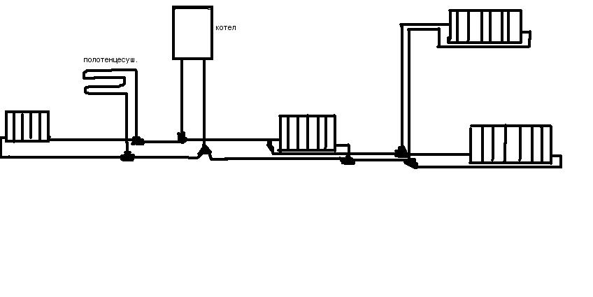 Чтобы уровнять температуру во всех радиаторах, необходимо прижать тот, что слева, в том числе и полотенцесушитель, больше, чем другие радиаторы. Это нужно делать "методом тыка" в Вашем случае. Радиаторы, которые справа, тоже нужно будет отрегулировать: у самого дальнего кран должен быть открыт на полную, средний - чуть призакрыть (например, на пол-оборота), а ближний - ещё больше призакрыть (например, на 1 оборот). И так постепенно Вы выровняете температуру во всех помещениях. А если есть возможность, то я бы посоветовал поставить на радиаторы автоматические терморегуляторы. В этом случае Вам не придётся постоянно прикручивать/откручивать краники.