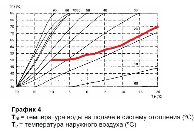 Да, Кривых 99. В инструкции указаны промежуточные, к маркировке которых нужно добавить нолик справа. То есть, если вы хотите установить кривую №2 с диаграммы, вы ставите на котле 20. При работе по ней, котёл, видя забортную -10 (например) будет держать теплоноситель 60 градусов. При повышении забортной температуры котёл будет уменьшать температуру, смещаясь по кривой влево. При понижении, соответственно, вправо.