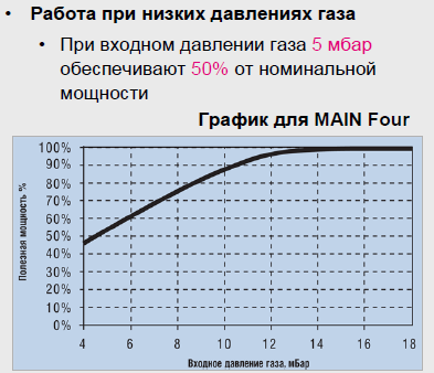 Производителем заявлена нормальная работоспособность котла при давлении газа вплоть до 5 мбар. Другое дело, что вы получите всего 50% заявленной мощности.