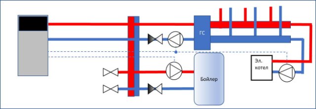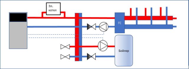 А по второму варианту - будет ли обеспечиваться эффективный подмес или электрокотел уйдет в аварийный режим из-за перегрева корпуса, ввиду незначительной циркуляции...хотя, наверное можно немного уменьшить сечение байпаса до 32мм (все трубы до разветвителя и ГС 40мм)- опять постоянный, но небольшой ток теплоносителя через электрокотел...