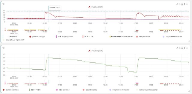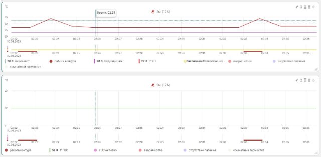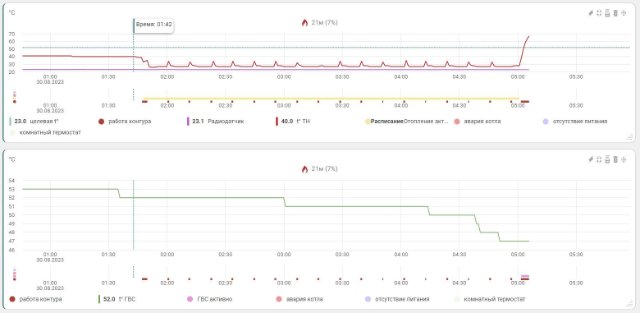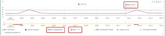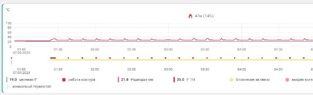 На приложенных графиках видно, что ночью котёл включает горелку методично 1 раз в 10 мин на 50 сек. При этом термостат (радиодатчик) показывает неменяющуюся температуру 23 град (т.е. запроса на включение котла быть не должно).