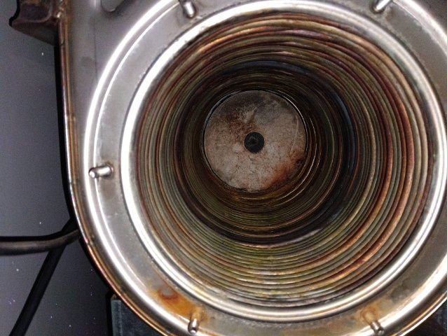 Я открыл камеру первичного теплообменника нашего котла Baxi Power HT. Здесь вижу 12 спиралей по 4 витка каждая в нижней зоне во всю длину котла. Одна спираль черная, две - коричневые. Видимо, в них засор. Остальные - светлые.
