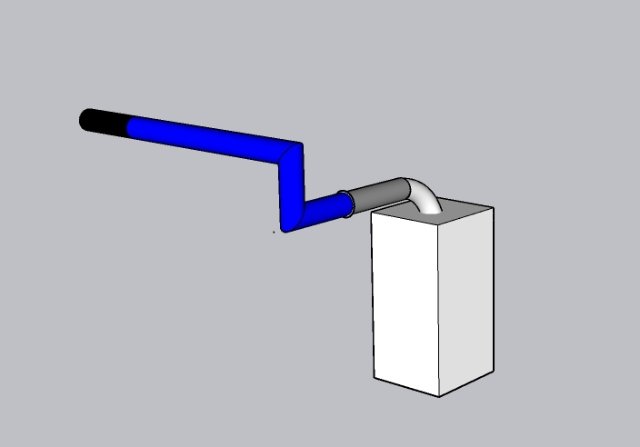 Здравствуйте! Будет ли правильно функционировать такая конструкция коаксиального дымохода? Часть трубы, выделенная серым, проходит через стену дома 0,5 м, синим цветом - 1,5 м через неотапливаемую пристройку, подъем и использование двух колен по 90 гр обусловлено необходимостью выдержать расстояние в 0,5 м от дымохода до верхнего края дверного проема. Конденсатосборник планирую установить сразу после выхода из стены в нижней точке.