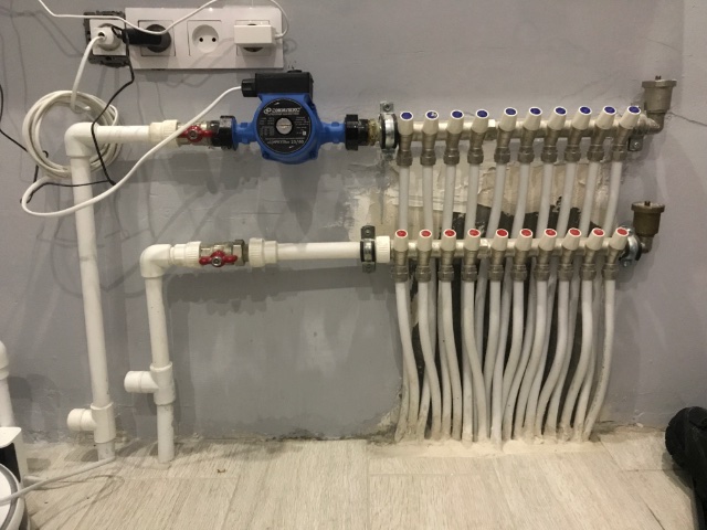 Фильтр, обратный клапан есть? На гребенку подача откуда идет, сразу от котла или ещё что-то на пути врезано?