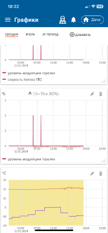 На графике же видно, что уровень модуляции практически всегда 0. Может просто скорости обновления не хватает попасть на тот момент, когда модуляция выше. Попробуйте в момент наполнения ванны посмотреть. У меня как у вас график, котел придушен настройками в режиме отопления на минимум, модулирует выше только в режиме ГВС.