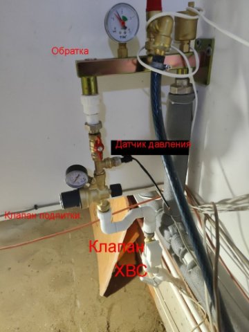 далее вода из ХВС подается в обратку через "Клапан автоматической подпитки с манометром", который настроен на давление 1.5 бара