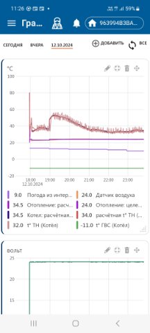 Добрый день. Недавно стал обладателем системы отопления с котлом baxi ecofour 1.24f в связке с baxi connect+. Установил режим контроллера с opentherm с управлением по температуре воздуха, вроде все работает нормально, но немного смущала дельта температуры котла, 35-80 в режиме комфорт, и 30-65 градусов в режиме эконом. В общем, смущало, что нагрев батарей отопления происходил в этом диапазоне. В этой связи решил попробовать включить режим с пид-регулированием, хотя в паспорте на BC+ он рекомендован для конденсационных котлов. И о чудо, получил действительно комфорт, после установки режима батареи отопления постоянно 34 градуса, котел 34 плюс-минус 4, а датчик воздуха строго 24 плюс-минус 0,2. Но вот котел в установившемся режиме минута работает, три-пять отдыхает. Циркуляционник постоянно включен. А расход газа практически минимальный насколько возможно. (на 6 часов около кубика ушло в установившемся режиме). Настройки котла в режиме по умолчанию. Картинка вот такая. В 19.00 изменил температуру срабатывания с 23 на 24 градуса .