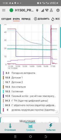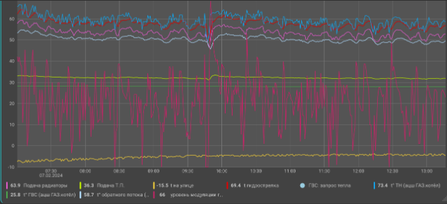1) Вначале это работакло так, что температура теплоносителя менялась как-то сама в небольшом диапазоне, в зависиости от нагрузки видимо. Модуляцию колбасило даже на стабилизировавшейся системе от 40% до 0% на коротком промежутке времени.