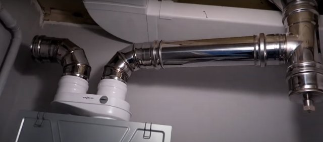 В теплогенераторной установлен сэндвич 150 мм для дымоудаления через холодный чердак на крышу и 150 мм нержавейка для вентиляции таким же образом. Планировал поставить газовый атмосферник Baxi Eco Four 1.14. Проектант рассчитал диаметр вентиляции 200 мм и еще кучу хотелок для приточки. Вопрос: можно ли при замене котла на Baxi Eco Four 1.14F( с турбиной) использовать существующие, уже смонтированные трубы, если брать не коаксиальный дымоход, а раздельный. Причем хотел бы брать воздух именно из помещения. Не будет ли это нарушением каких-нибудь СП, и примут ли газовщики. Проектировщик четкого ответа не дал, в проекте написал, что привязка дымохода и вентканала проектом не предусмотрена. Нашел картинку для примера, хотел бы вот так, если подсоединиться к венттрубе для забора воздуха, то в помещении не будет вентиляции.
